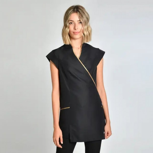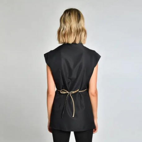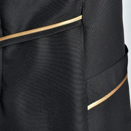 - Bata de spa e beleza em microfibra preta com cetim dourado vívido.