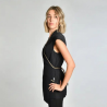 - Com um elegante debrum em cetim dourado no decote, fitas e bolsos.