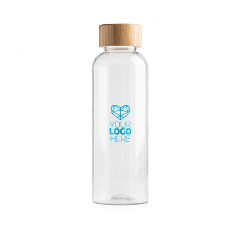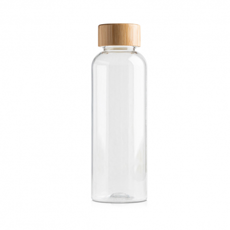 Garrafa em RPET 500ml com tampa em bambu. Uma garrafa amiga do ambiente, em PET reciclado reutilizável. Poupe o ambiente a dobrar com a reciclagem e a reutilização.