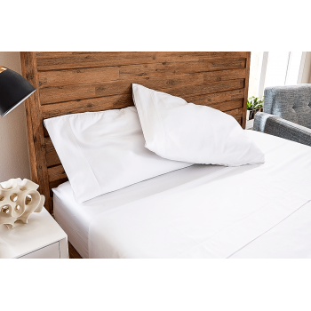 Toalha de mesa branca anti-nódoa com bainha simples com cantos sobrepostos.