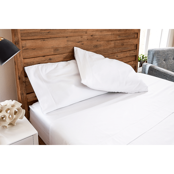 Toalha de mesa branca anti-nódoa com bainha simples com cantos sobrepostos.