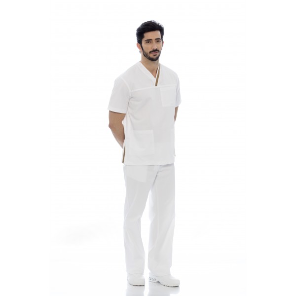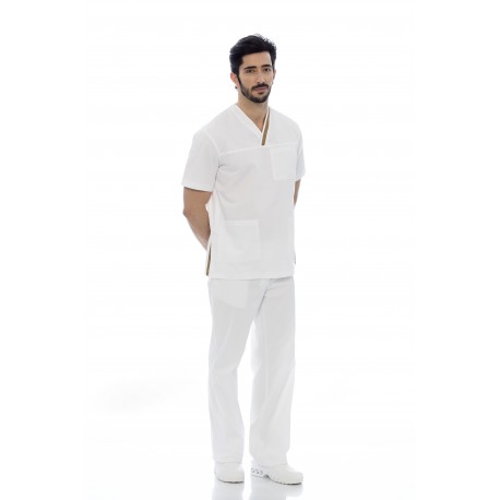 Túnica homem em sarja poliéster-algodão de manga curta.