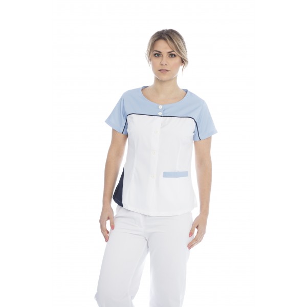 Túnica senhora em minimate poliéster com botão retangular, contraste branco